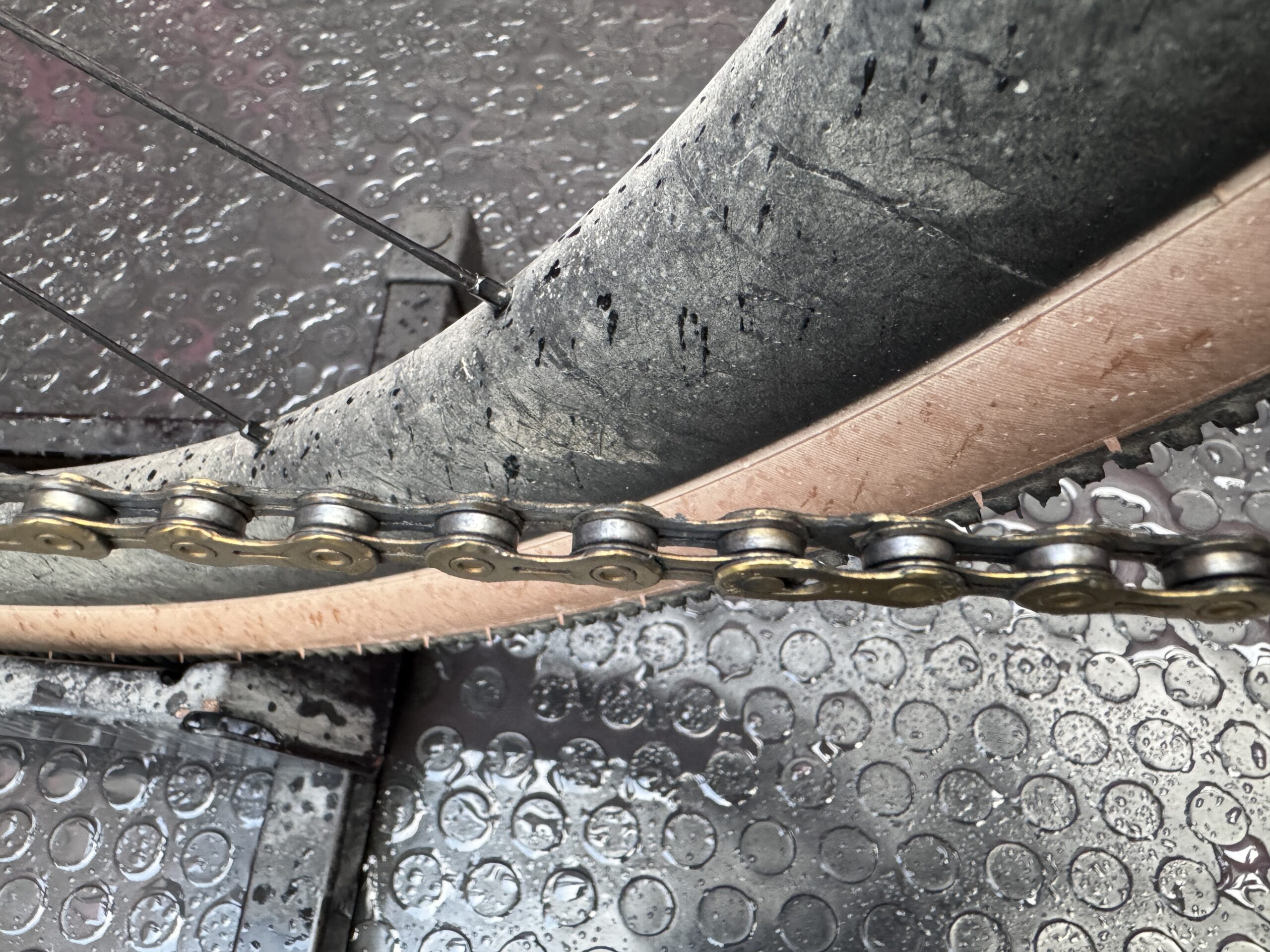 チェーンルブ(チェーンオイル)と地面から巻き上げた泥、ホコリなどが混じった汚れです。