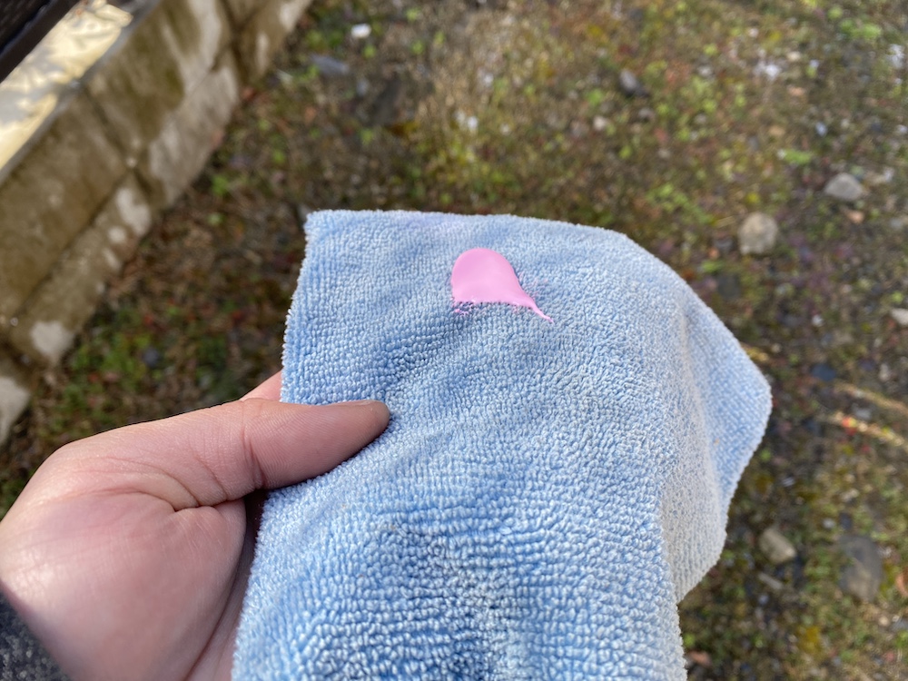 放置して液体が白くかすみ始めてきたら、マイクロファイバータオルで艶が出るまで磨いて仕上げていきます。