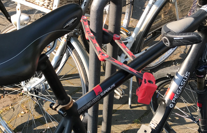 駐輪している自転車を見てみると、これでもかというくらいABUSだ。
