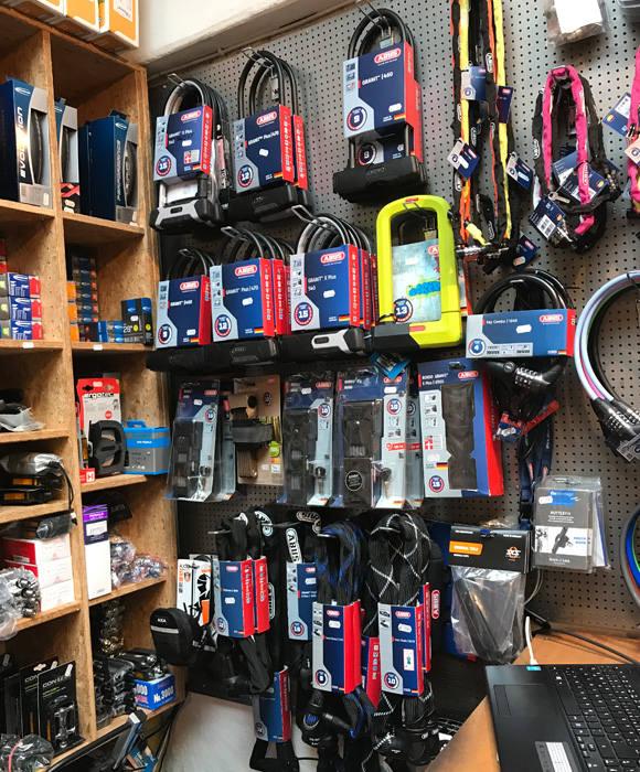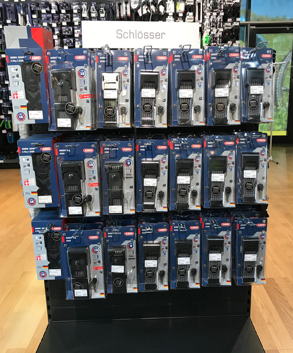 お店に行ってみる。 日本の自転車屋さんと違うカギのラインナップに驚く。 基本的にLEVEL10以上のラインナップが中心だ。 街中で見かけるABUSのシェア、LEVELの分布が そのままお店のカギコーナーに反映されている。
