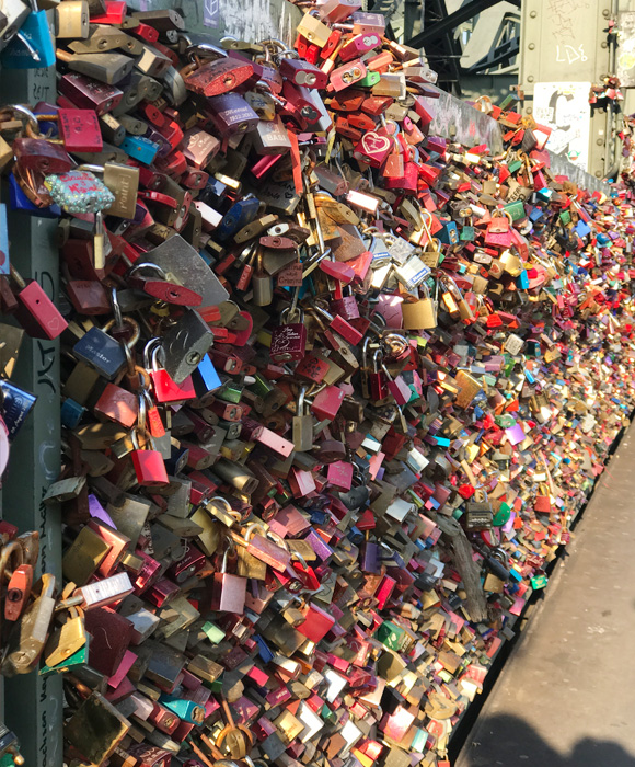 調べてみると、ホーエンツォレルン橋という橋でヨーロッパ各地で2000年代初頭にスタートしたらしい。 ただ、重量や安全面で撤去する動きもあるようだが、市民の反対でこの橋は守られているよう。 こういう文化というか、ジンクス的なものはいいなあと思った。