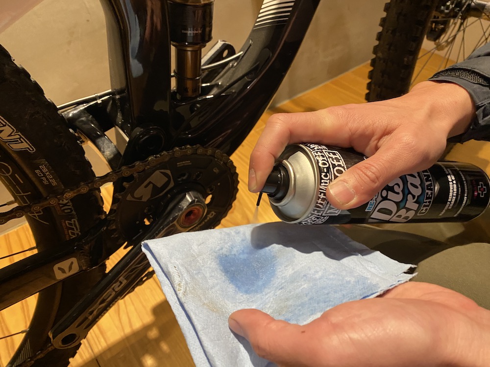 フレームの表面に泥などはなさそうなので、ディスクブレーキクリーナーでの脱脂作業にいきなり入ります。