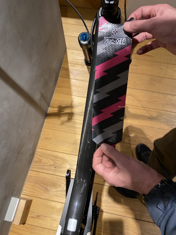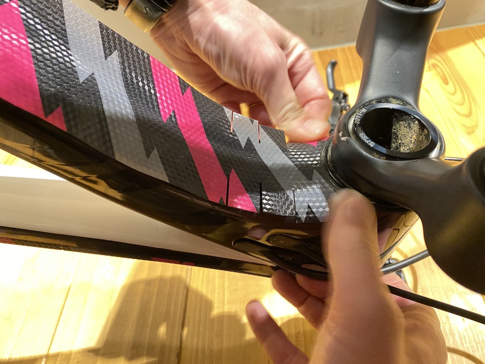 センターを合わせながらヘッドチューブ側から、端を決めたら、まっすぐ後方向に貼っていきます。