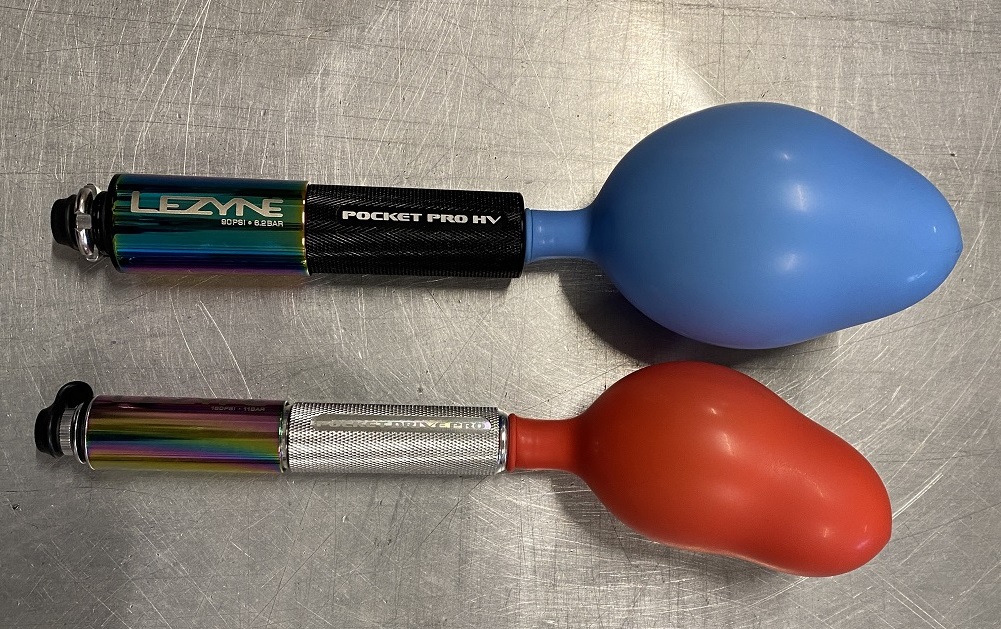 短くなるとその分1回のポンピングで入る空気量が少なくなりますが、HV(ハイボリューム)モデルは直径を太くすることで対策しています。(最大空気圧が低くなります)