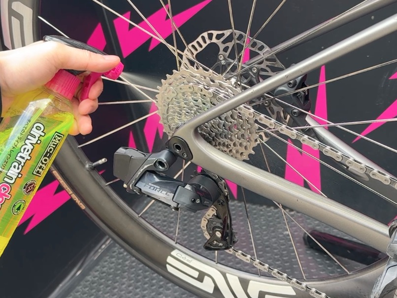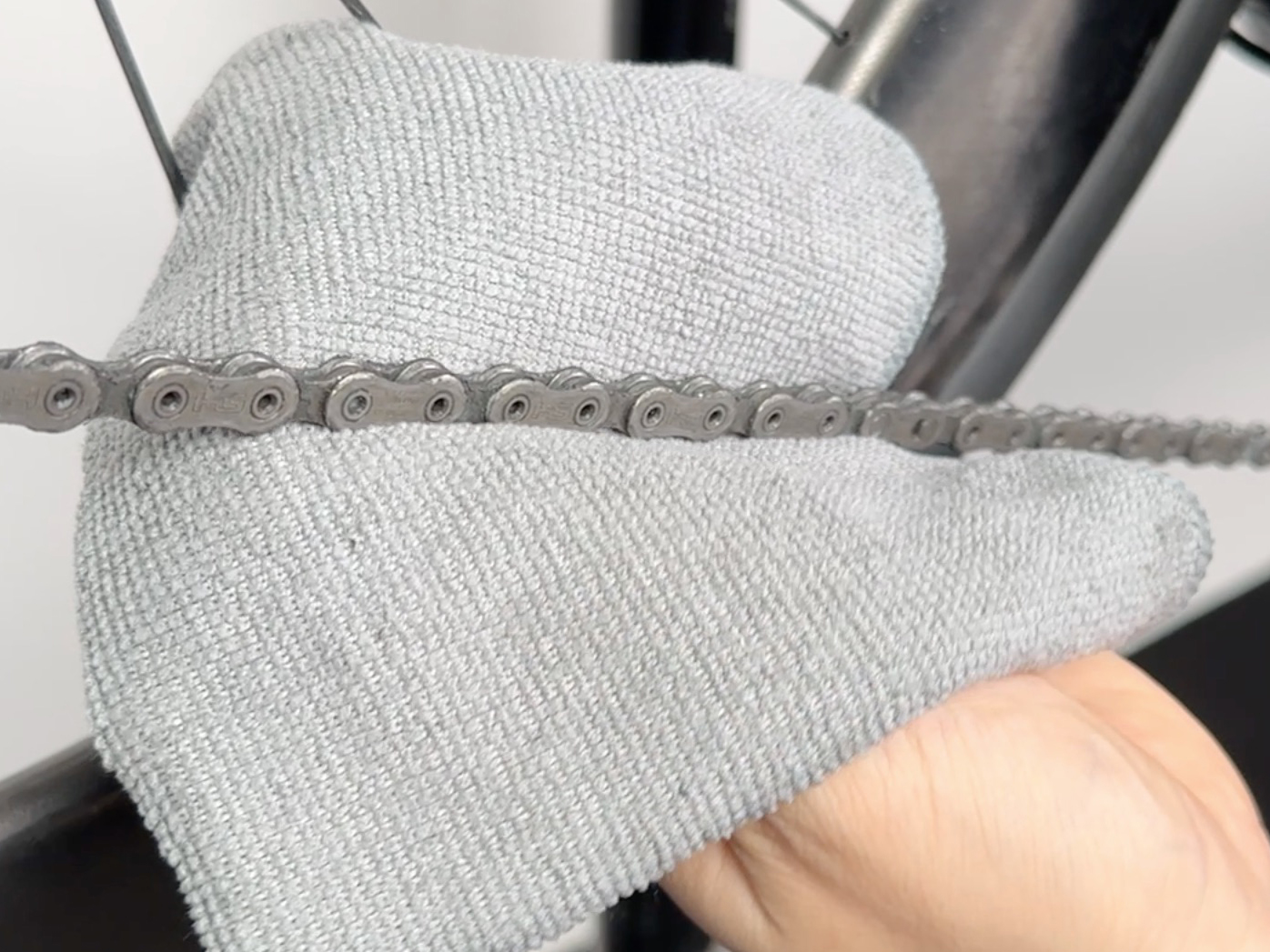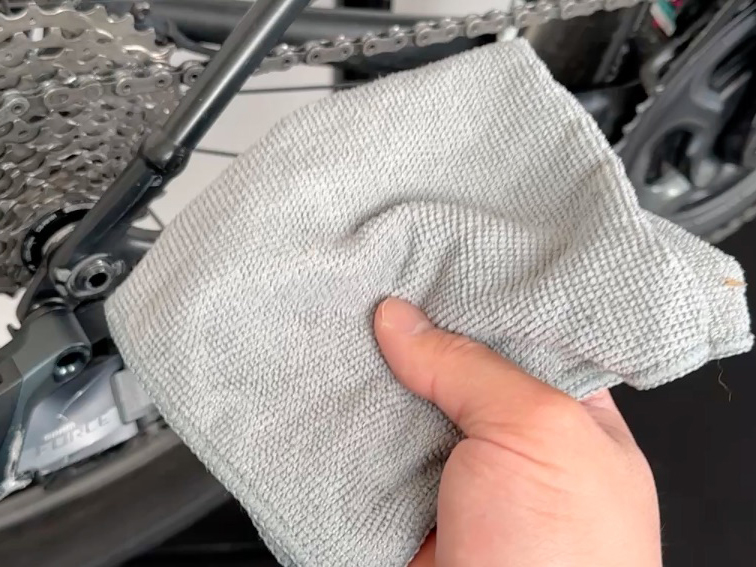 きれいなマイクロファイバークロスでチェーンを包み、クランクを回して表面の汚れを拭き取ります。