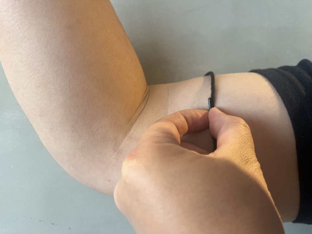 メーカー推奨サイズから1.2サイズ下のサイズを着用してもメッシュ構造によって伸縮性がよく違和感なく着用することができた。関節を曲げ伸ばししても生地が寄らず着け心地が良かった。