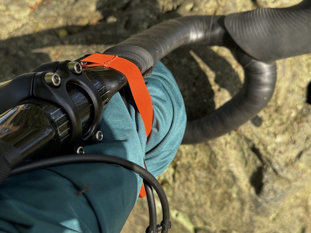 丸めたウィンドブレーカーをトップチューブやハンドルバーに。