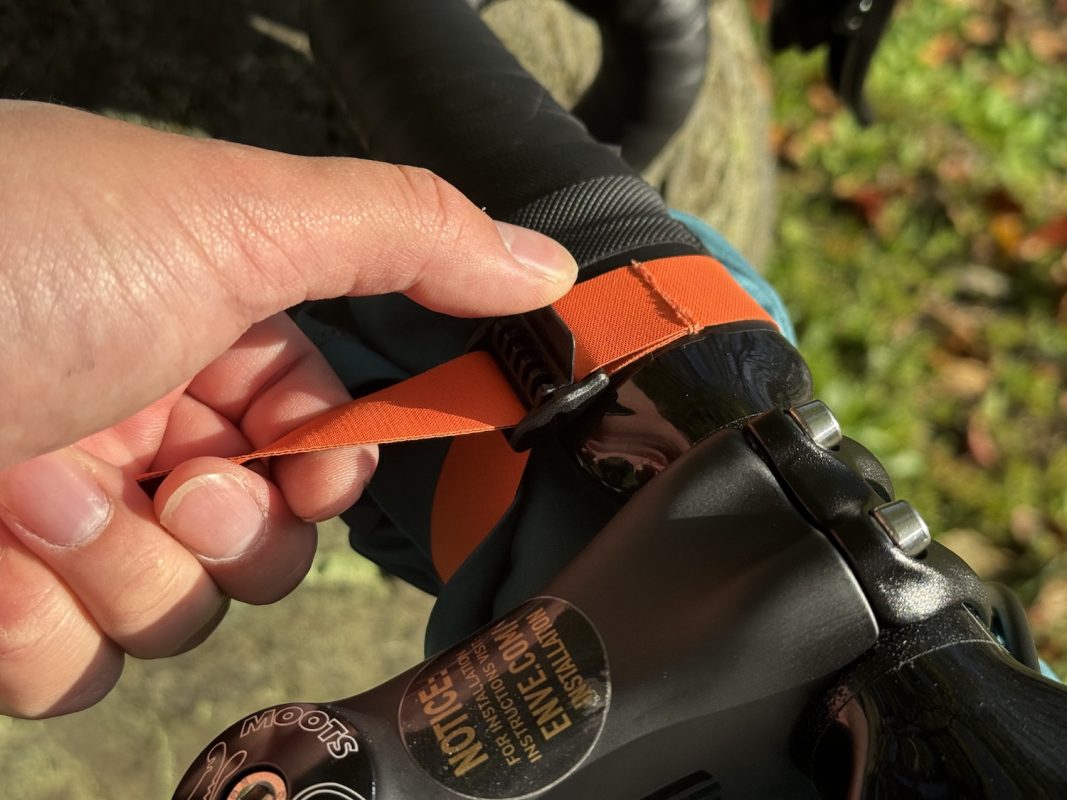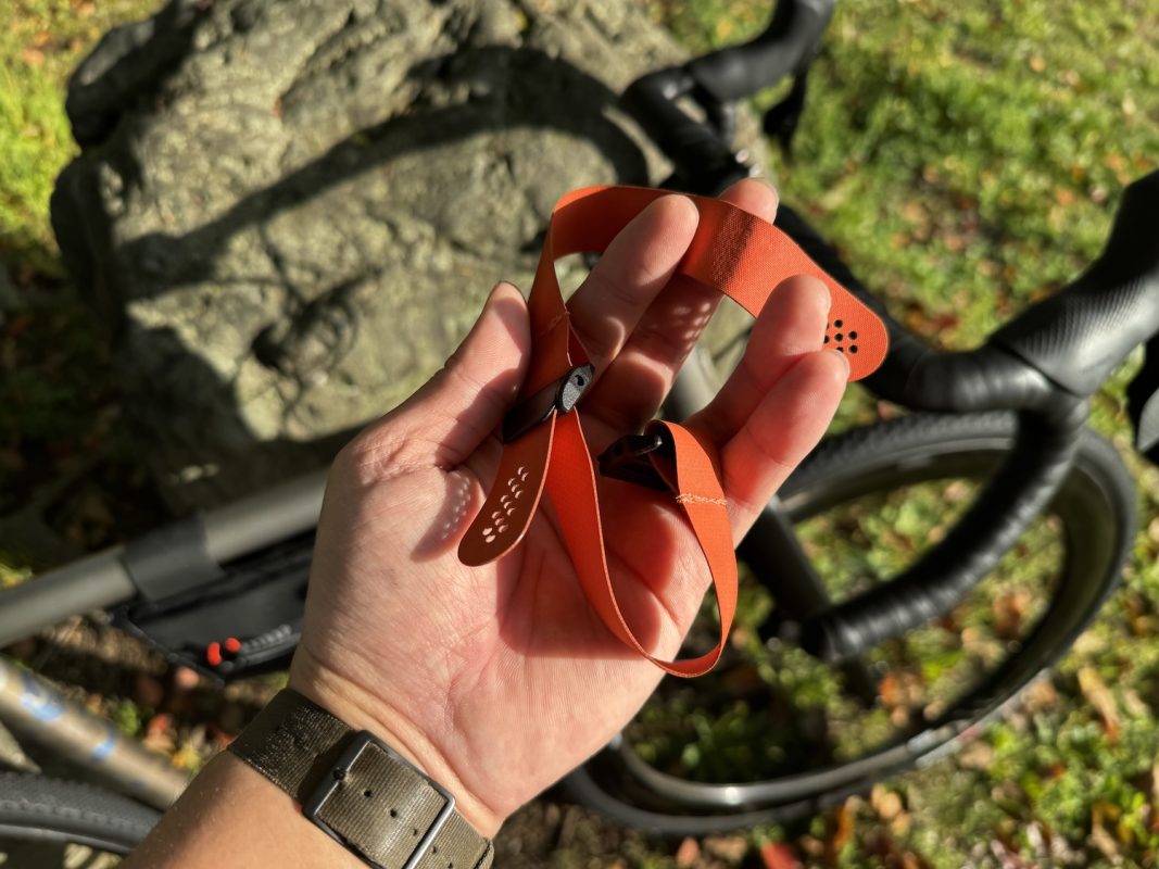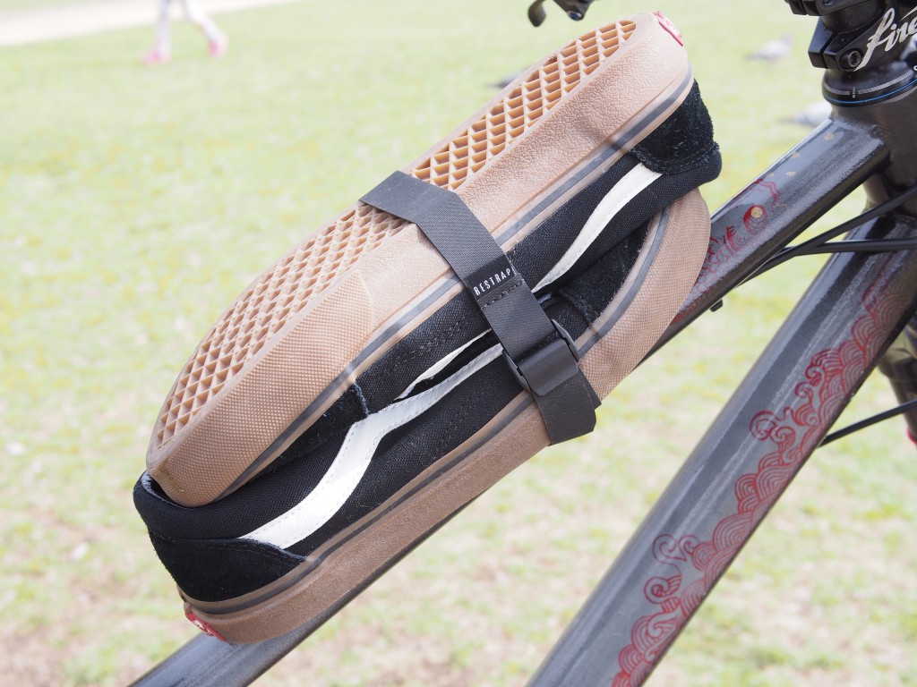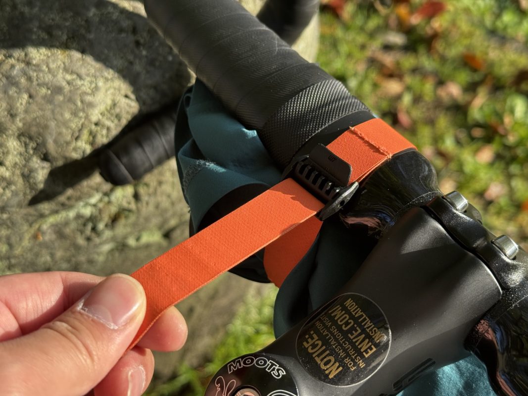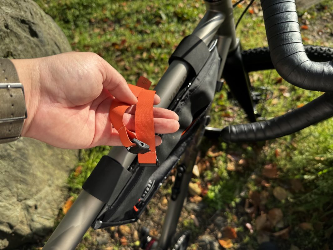 自転車のフレームやサドルレールなど、空いているスペースを瞬時に積載ポイントに変えられるのがこのストラップの強みです。