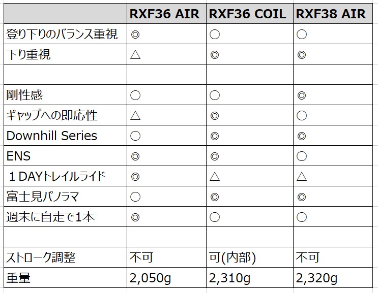 今日みたいな一気に登って、斜度のきついコース所を一気に下る場合だとコイルもいい、滑りやすい所での反応の早いサスペンションは=安心感に。こういった事を考えるとレースでタイムを出すとするなら、RXF36COILでもいいかもしれない。