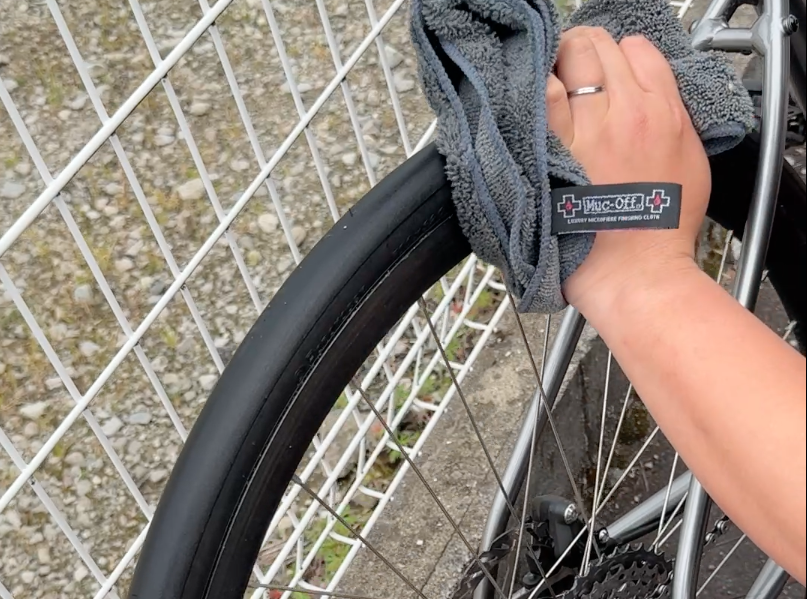 フレームの汚れを拭き取った後、その流れでタイヤも一緒に洗浄しましょう。