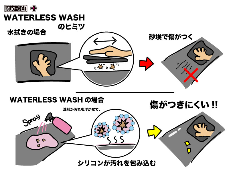 そんな時に、車に忍ばせておくと良いのが、Muc-Off(マックオフ)の「Waterless Wash」