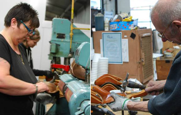 隣りの皮工作部に進むと平ペッタイ大きな皮が、くびれたサドルの形が、ポコンポコンといくつも抜かれて穴ぽこだらけ。 そして成形され金属ベースと無事合流。 鋲を器用に打つのは人間、工作機械は小さくなって、金づちやナイフとかで、どんどん人間の技が最後の仕上げに向かって行く。