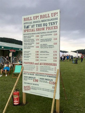 何本かの道が集まった街は高台の教会の塔がほぼ中心にあって、まわりの商店のショーウインドウにエロイカのポスターや自転車などが綺麗に飾られて、歓迎ムードにあふれている。駐車場から会場に向かう人が列になって向かう。