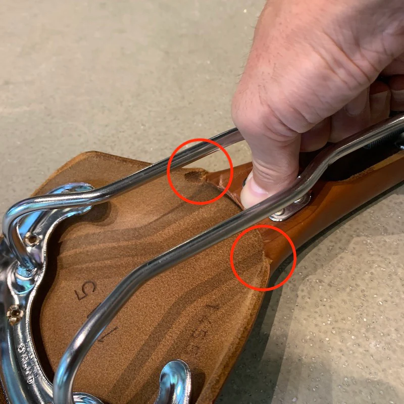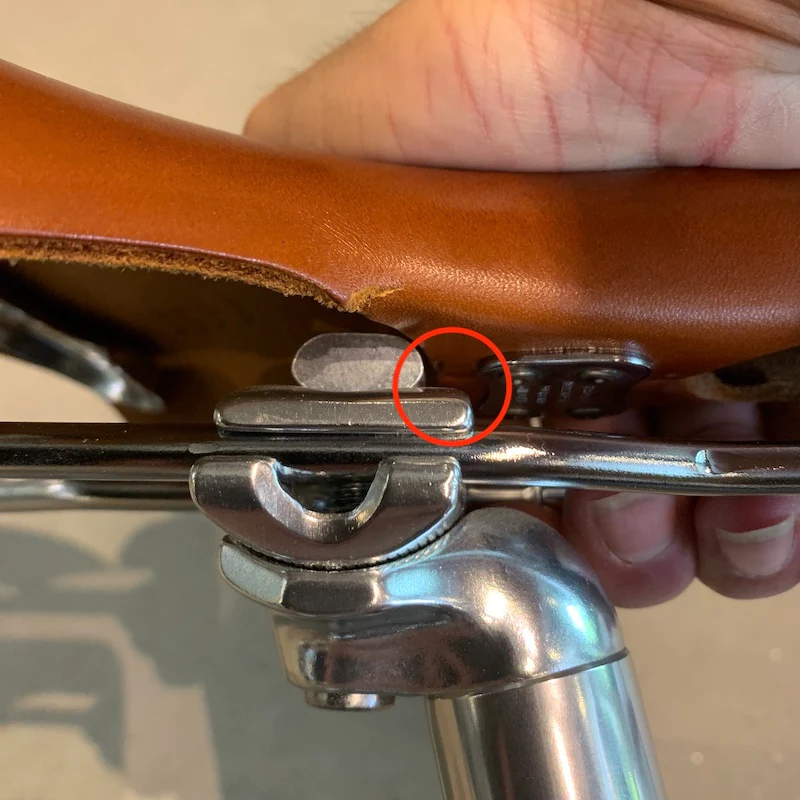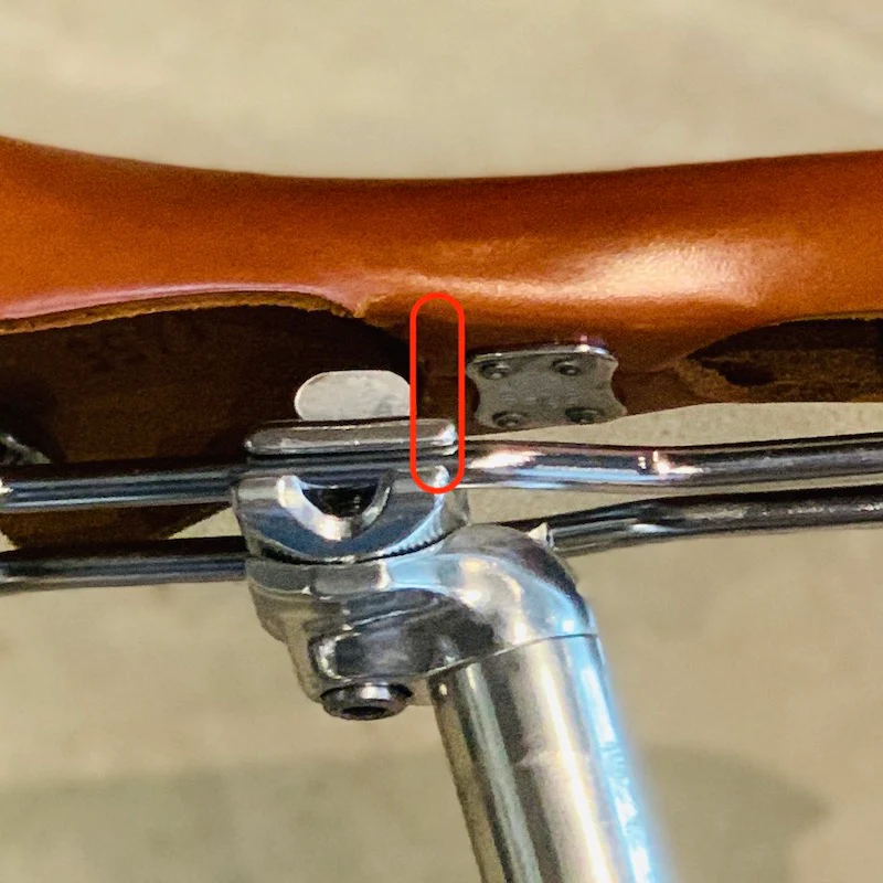 写真では干渉していませんが、サドル下の革の部分がこのまま下がってくるとシートポストにあたってしまいます。
