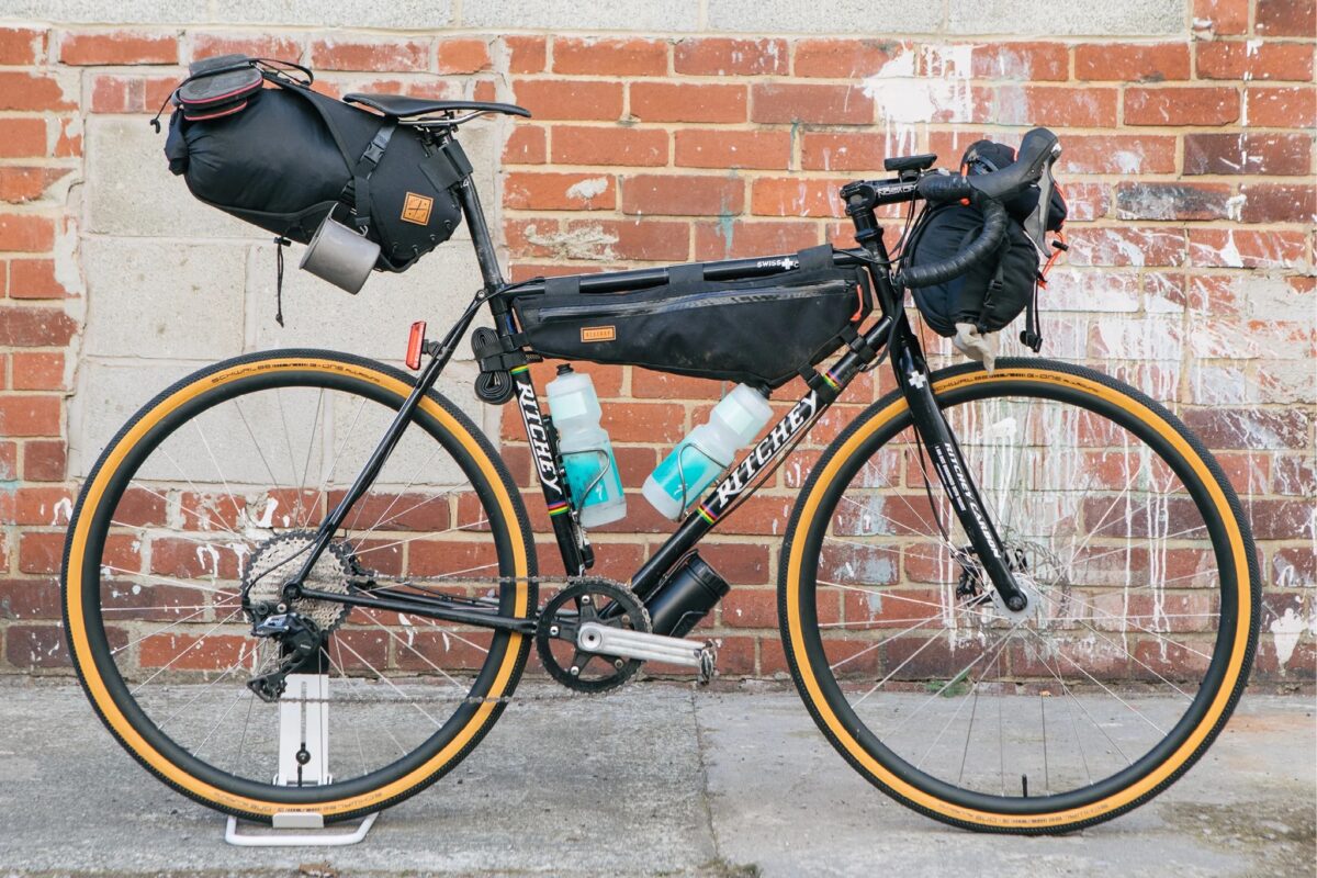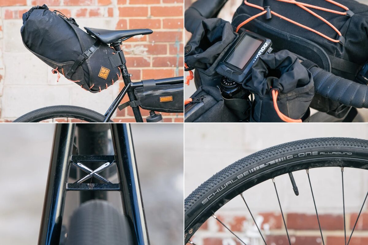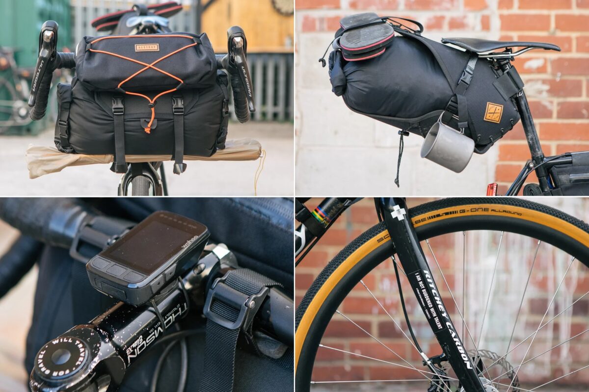 BIKEPACKING BAGS: Bar Pack, 14L saddle bag, Large Frame bag, top tube bag.