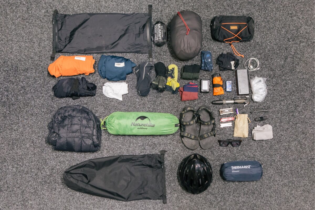 ボトル×2、ツールボトル、LEZYNE 防水ポーチ、チタンマグカップ、救急セット、 サイクリンググラス、サコッシュ、洗面用具、高速充電器&変換プラグ、SPF30 日焼け止め、SPF15 リップクリーム、Restrap FAST STRAP×4、マイクロファイバータオル、カードケース、イヤホン、予備のカメラバッテリー、バッテリーバンク、スプーンフォーク、充電ケーブル