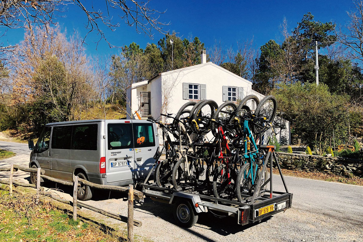 サグの調整を済ませ、オーリンズが前後装着されたマウンテンバイクをトレーラーに積み込む。