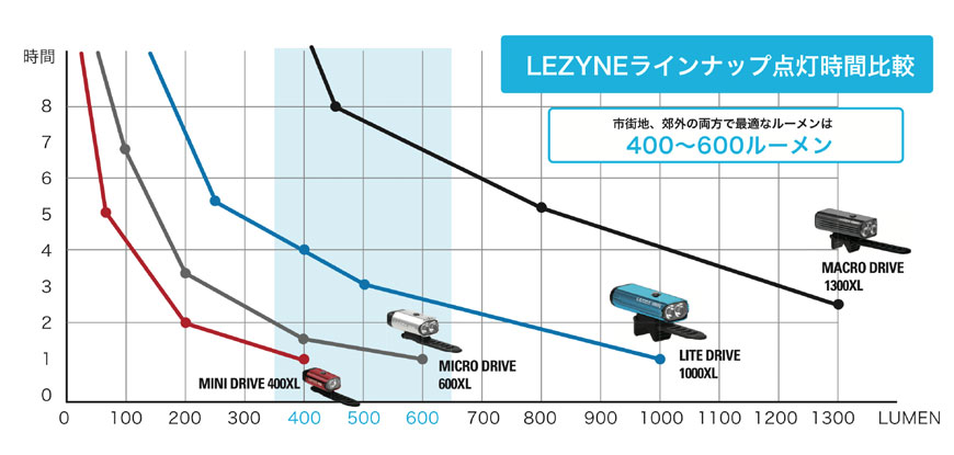 400ルーメンの点灯時に各モデルの点灯時間は MINIDRIVEが 約1時間・MICRODRIVEが 約1時間40分・LITEDRIVEが4時間とバッテリー容量に比例して長くなります。