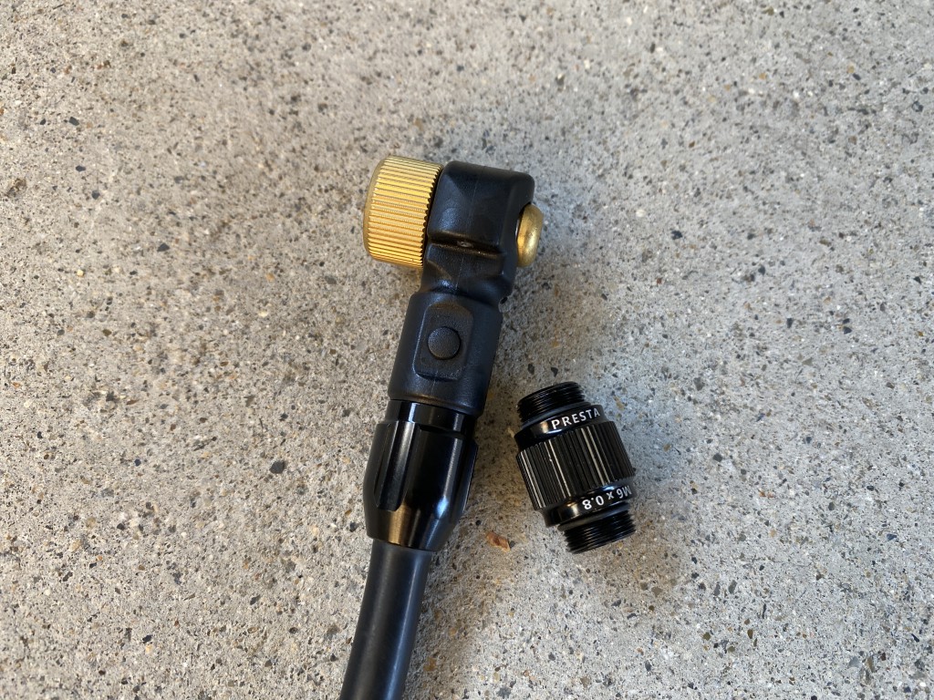 このグラベル用ポンプの口金は、通常のフレンチバルブ/米式バルブの切り替えでなく、フレンチバルブの反対がバルブコアを抜いたバルブのピッチに合う形状になっています。