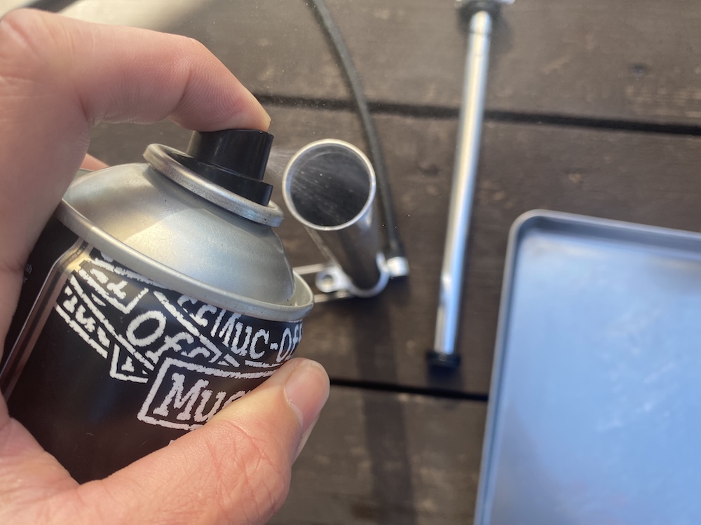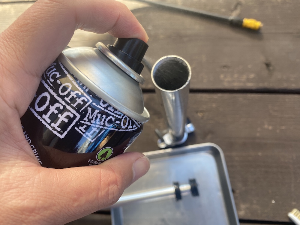 乾ききる前の防錆スプレーがホースの先から出てくるので、空打ちしてでなくなるまでしていきます。