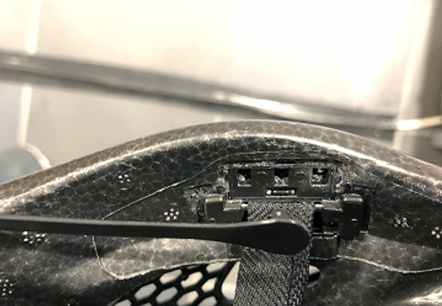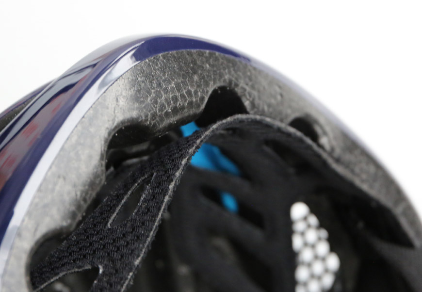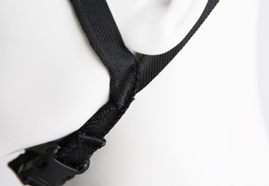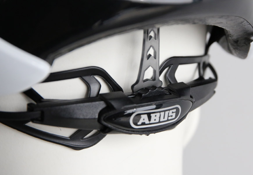 ストラップにはエアロストラップを採用。片側が厚く、頬に密着しやすい構造でを採用。ライド中に顎ひもがバタつきません。