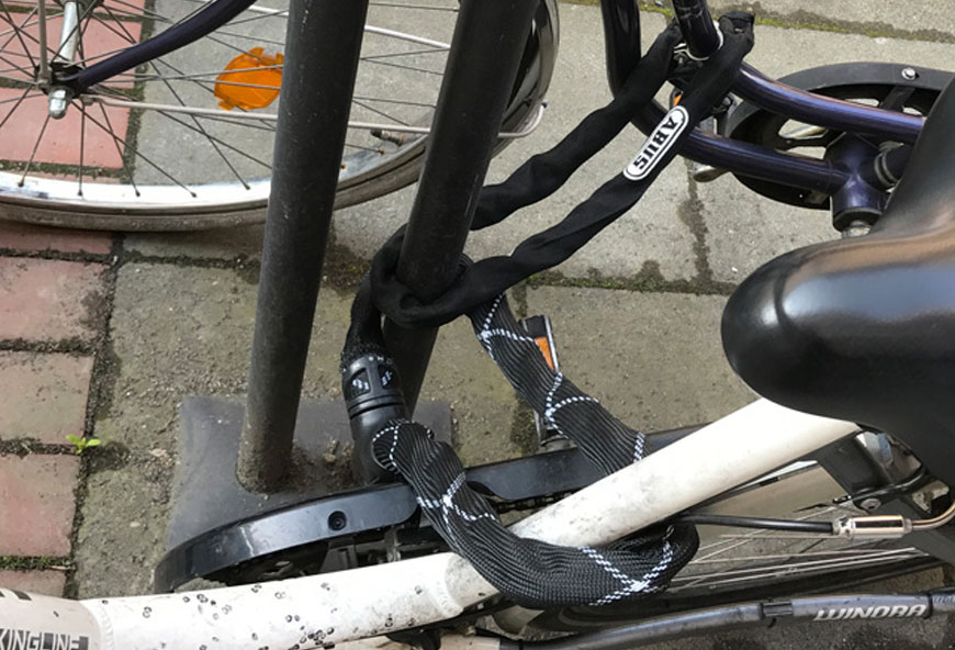 駐輪場を見渡してもほとんどが、ワイヤーロックや細いチェーンで止まっています。