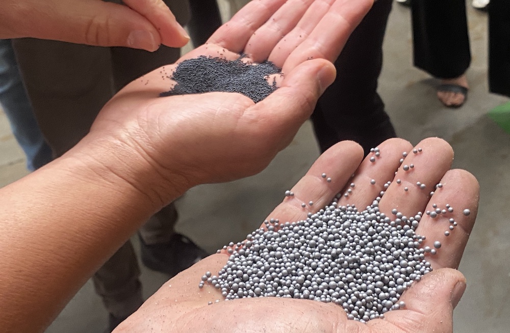 上の写真のサイズ違いのビーズで、通常のメーカーは大きい方を70%、小さい方を30%で埋めていくそう。