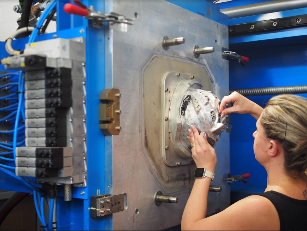 機械の型でEPSを成形する。中に埋め込まれるプラスチック製パーツをセッティングしている。