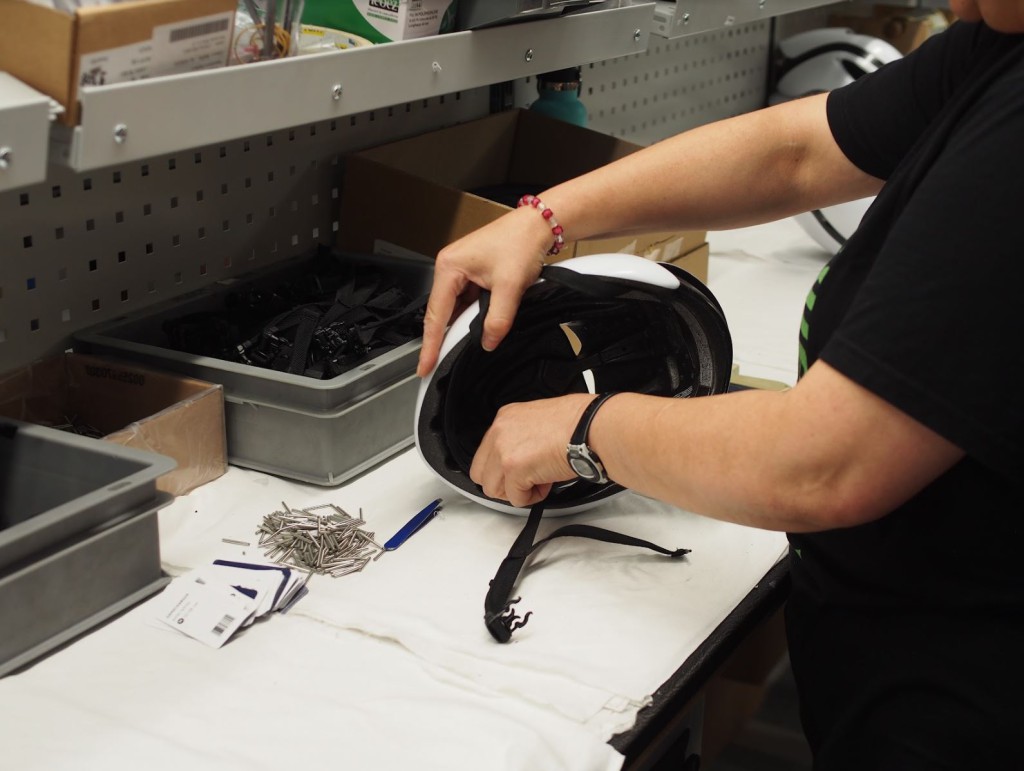 ヘルメットの帽体が完成したら、あとはあごひもやZOOM ACEなどのフィッティングシステム、内部のフローティングパッドなどが一つ一つ手作業によってつけられていく。