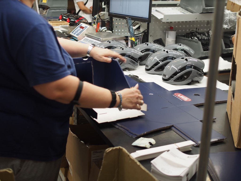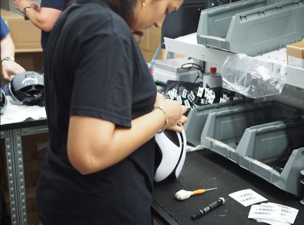 空港から30分ほど経ったところでバスが停止。工場に入ると、確かにそこでABUSヘルメットが0から作られていた。