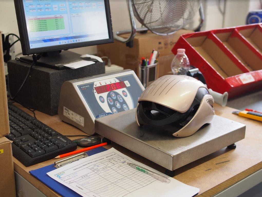 出来上がったヘルメットはスケールに乗せて重さをチェック