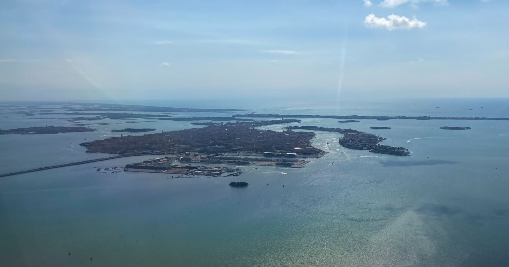 飛行機の窓からは遠くに「水の都」ベニスの街並みが見える。