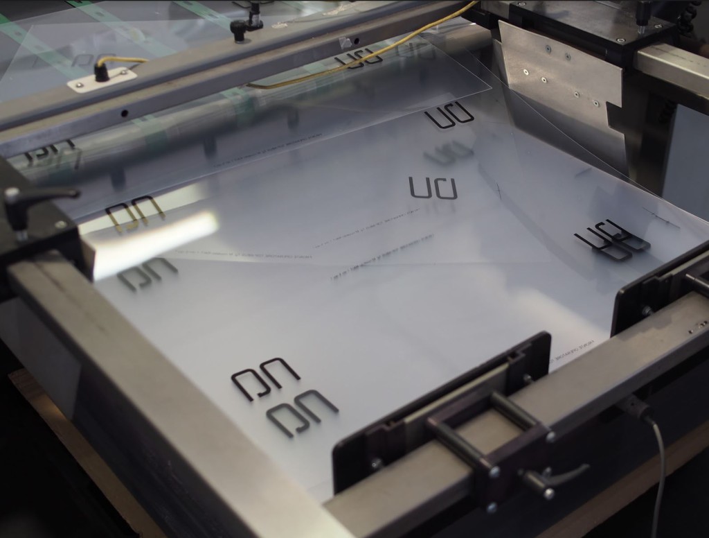 真四角のポリカーボネートの板に、各モデルに合うように色やロゴデザインを印刷する。