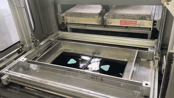 その後、板を機械の中の型にはめて、ヘルメットの形に合うように整形する。