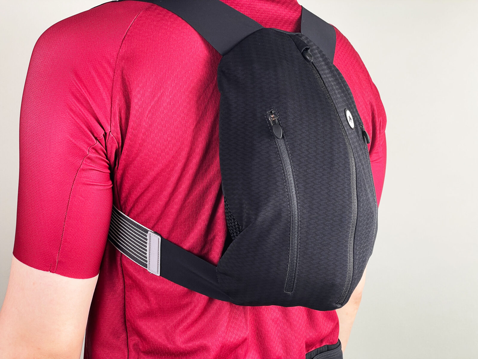 一見ASSOSのビブストラップと同じように見えますが、このストラップはスパイダーバッグ専用のストラップ。ビブストラップと同じようにねじれを防止するスタビライザーを搭載するなど今まで技術をうまく活用しています。
