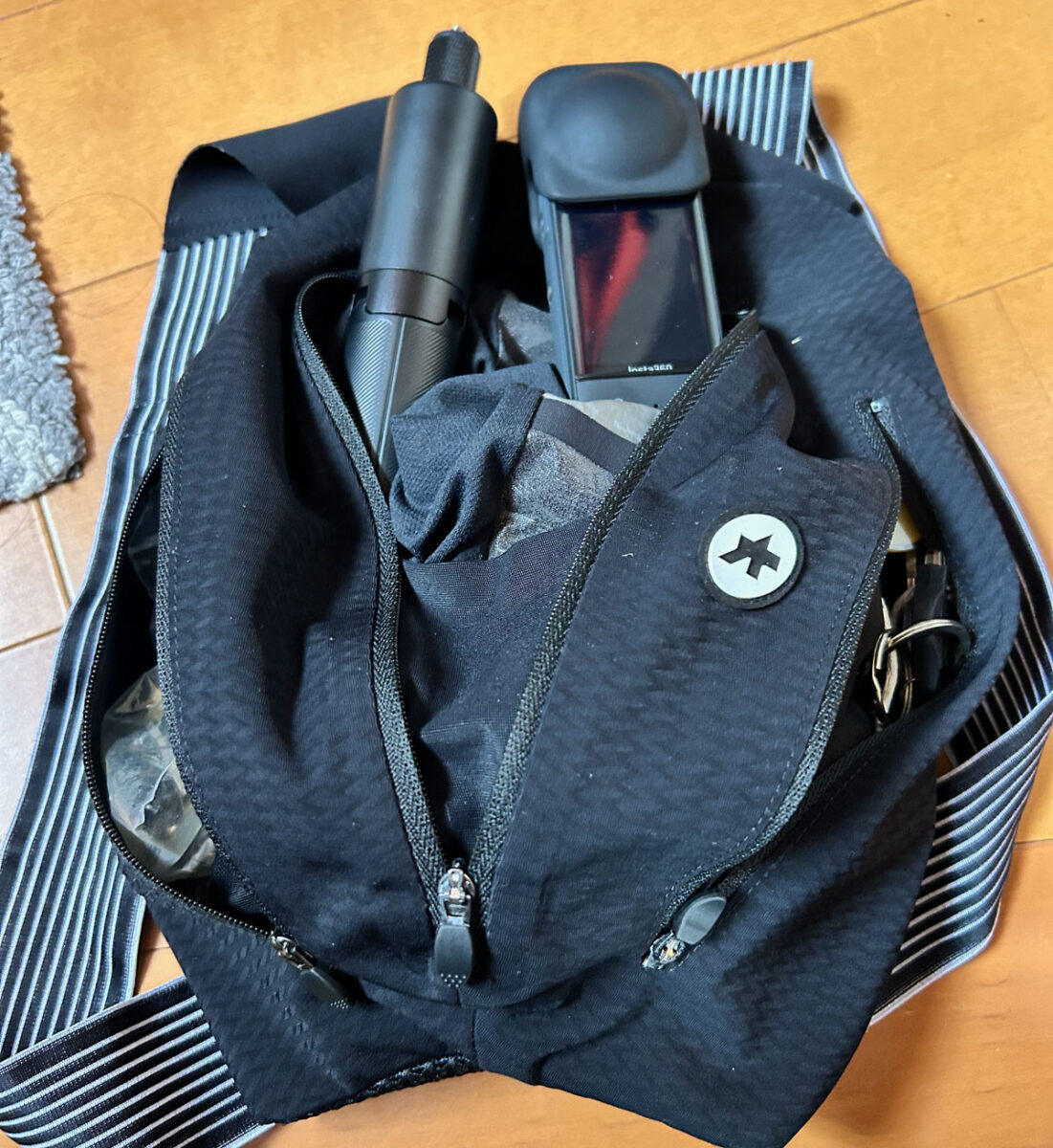 普段はかぎ、やイヤホン、充電ケーブル等を入れておく、生地が柔らかいので、物の形に変形してくれるので、結構雑に入れてもOK、ライド中にはありがたい使い勝手である。