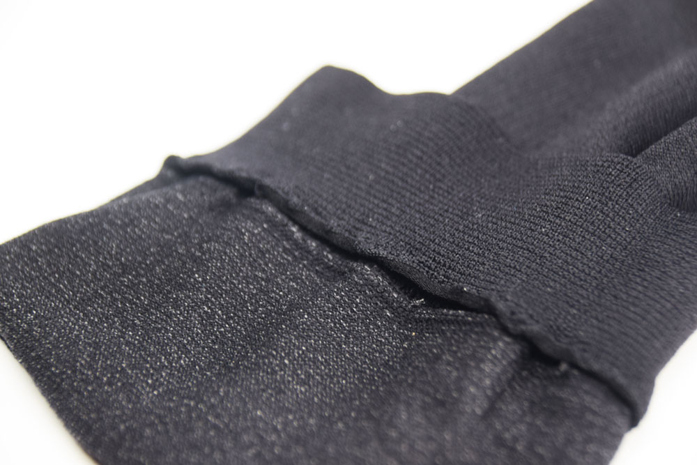 手首と腕回りは同じ生地を3.5cmほど縫い合わせ大きめのバンドのような役割をはたしているので、シリコンを使用せずにずれオチを防止することが出きます。