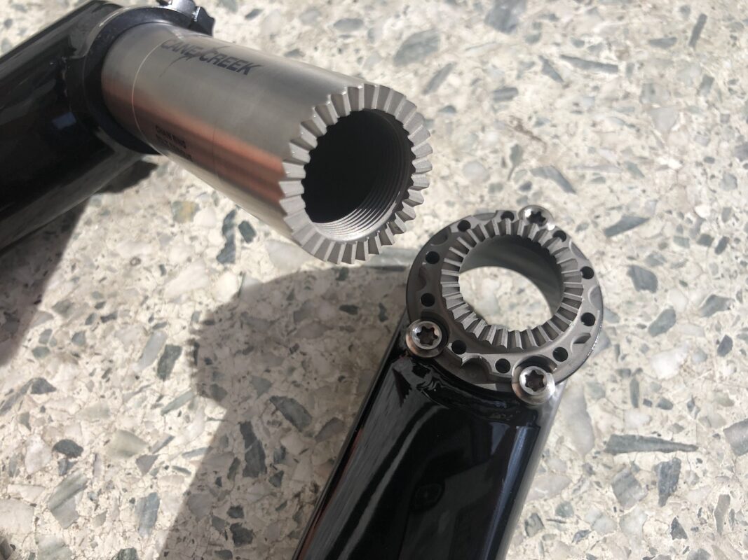 製造プロセスが複雑で時間がかかり精度も求められるのですが、パーツ点数が減らせることと、非常に高い負荷を伝達できること、緩み癖が存在しないことが自転車クランクにとってベストという考えでCANECREEKは採用しています。