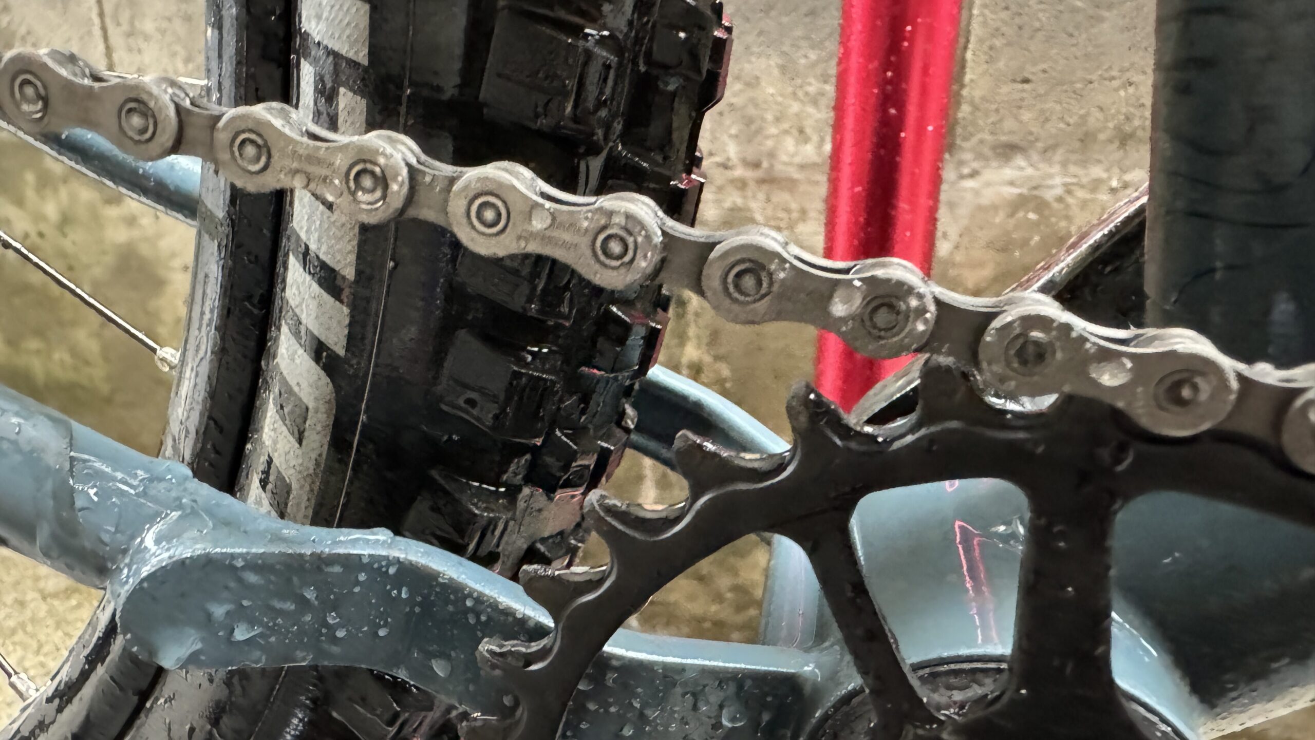画像を見て分かる通り、水で濯いでピカピカになったあとも、チェーン表面の水弾きが良いのがわかります。