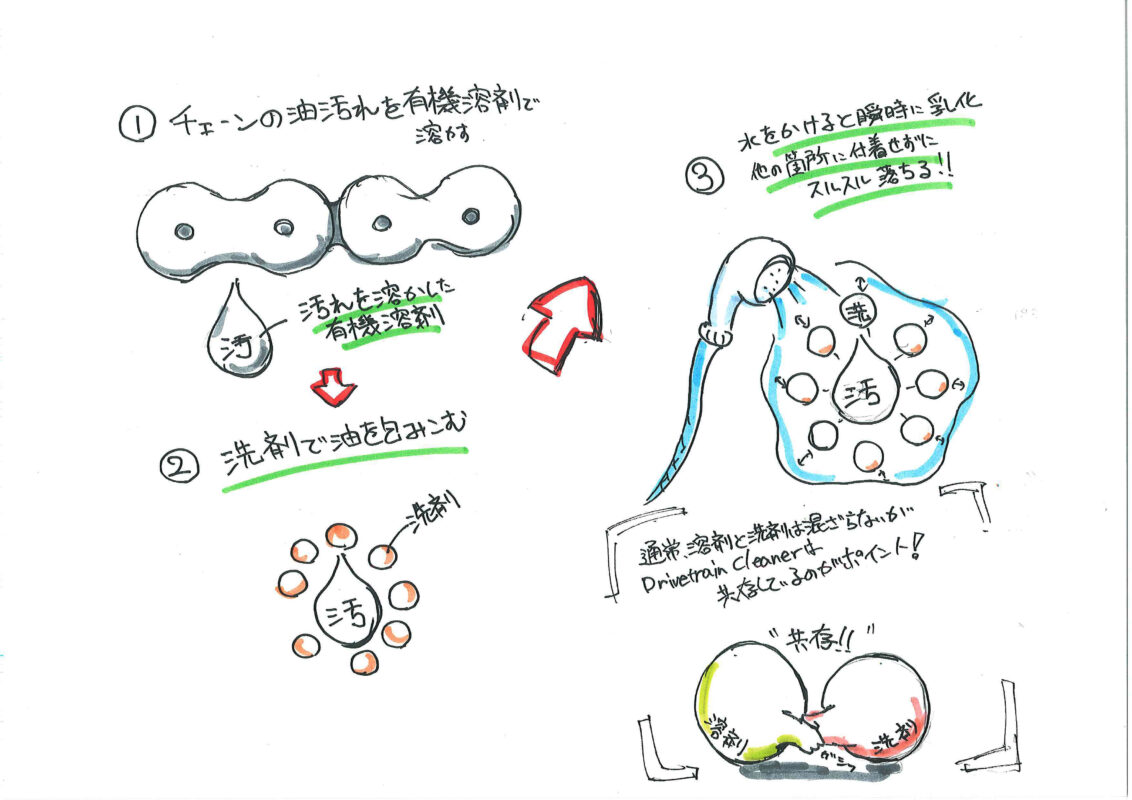 DRIVETRAIN CLEANERは、通常のディグリーザーでは水で濯ぎ切れない汚れを乳化することで再度汚れを付着させることなく濯ぐことを可能にしています。
