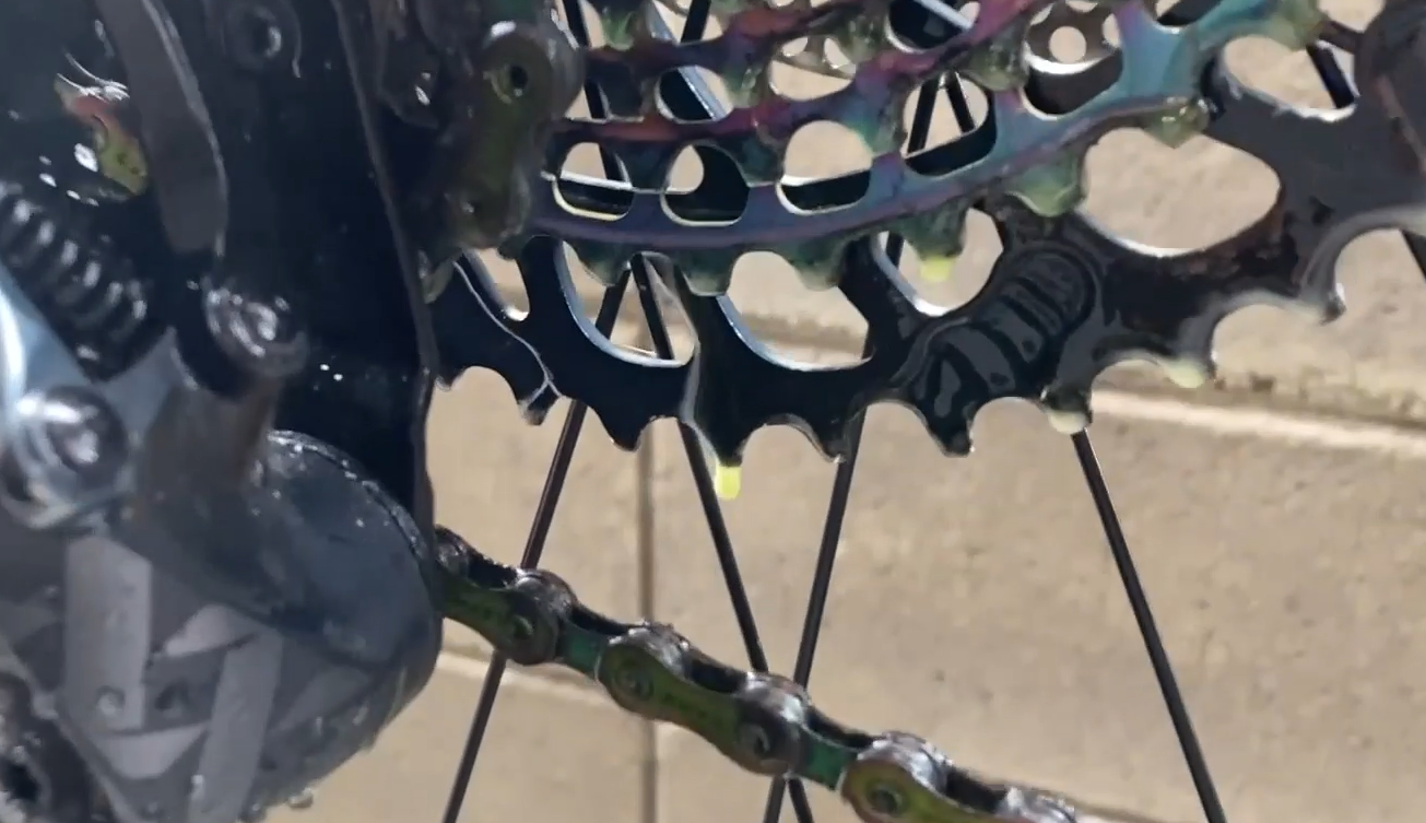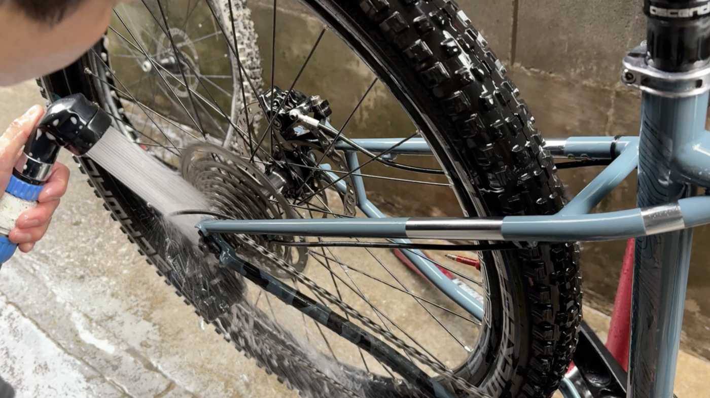 DRIVETRAIN CLEANERはツール・ド・フランスなどのレースの現場で素早く洗車するために開発されたクリーナーなので、チェーンが装着された状態でも素早く洗車できることを想定しています。