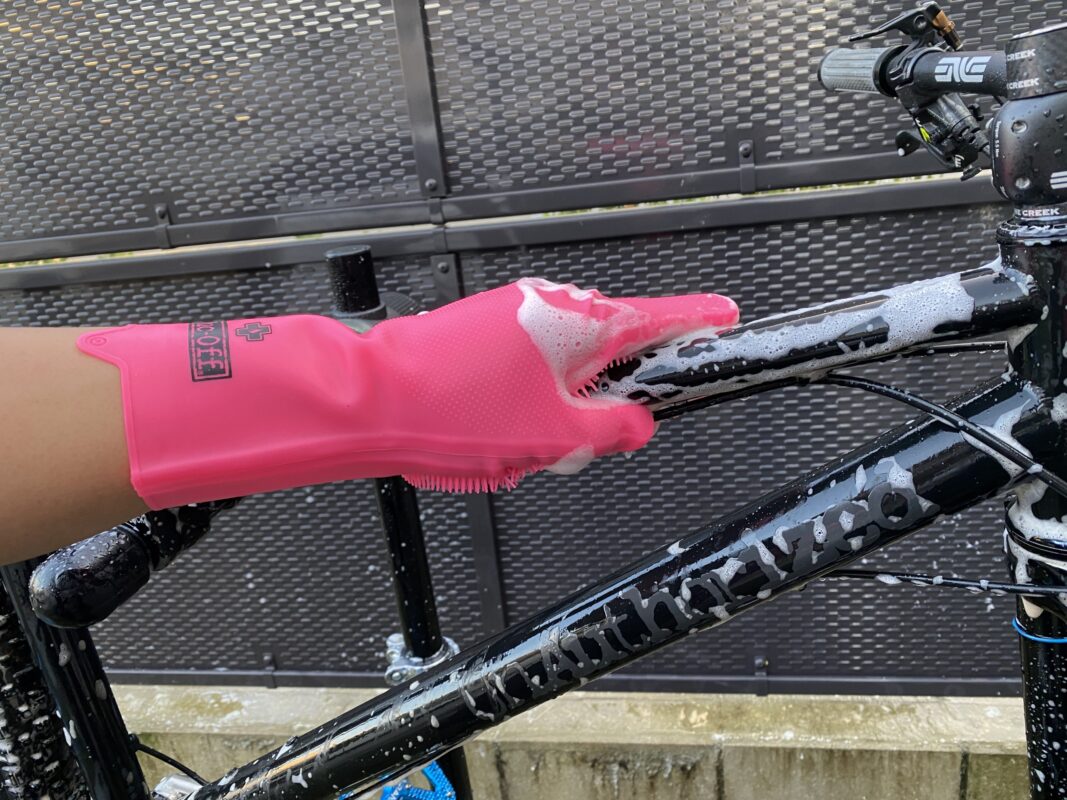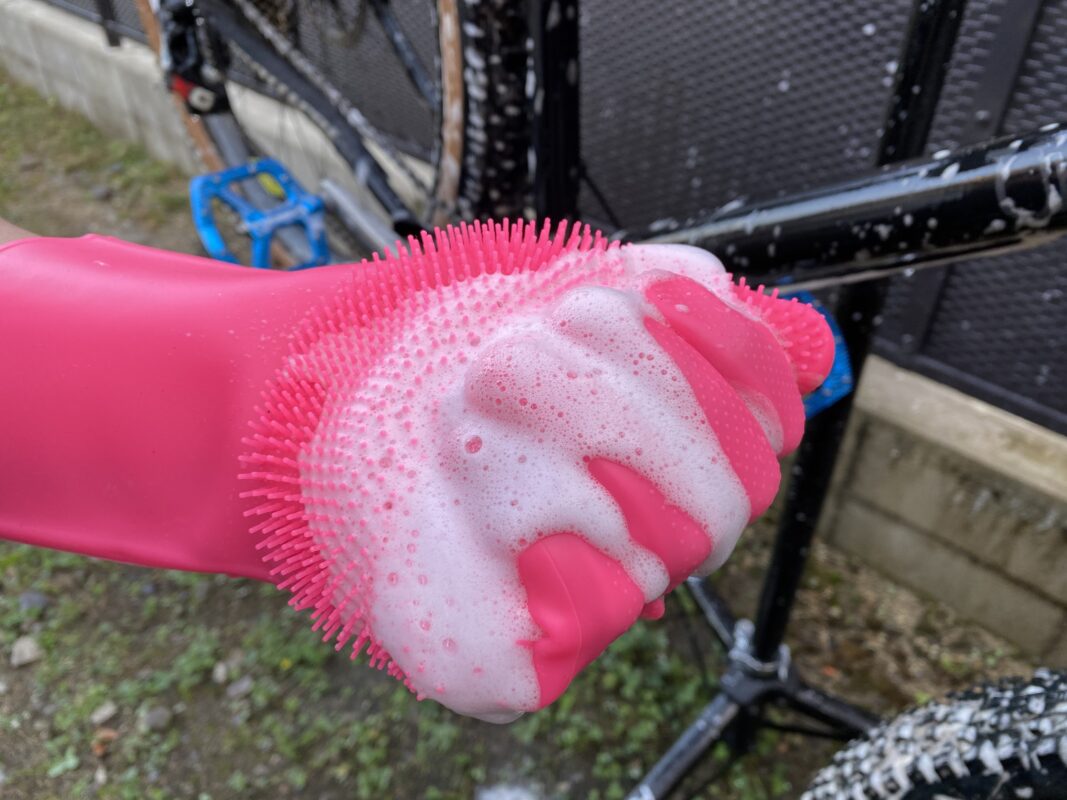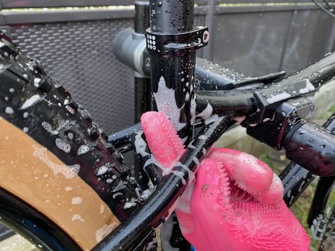 また、ハブ回りやシートステーの裏側などブラシがいきわたらない場所でも指を通せば一瞬で洗車ができました。