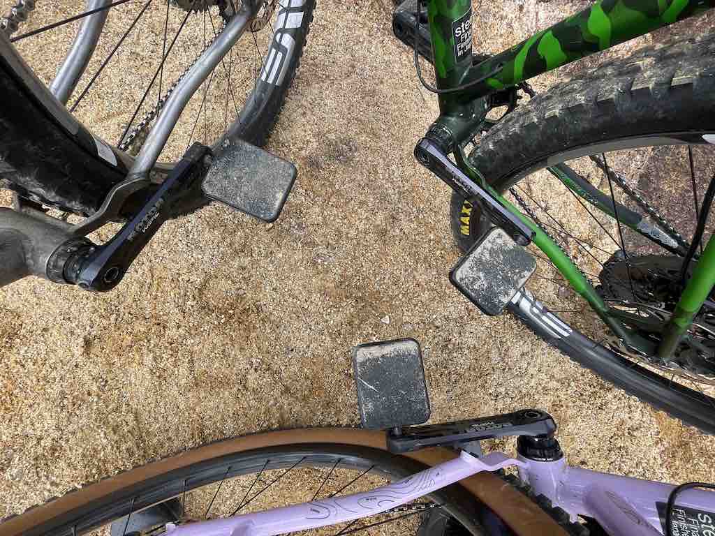完全にフラットなペダル(ゲージタイプやいわゆるMTBに使うような穴があるようなタイプではない)の楽さは感動的。特にロングライドで体感できる。走り終わった時の足裏の疲れ方に違いがでます。