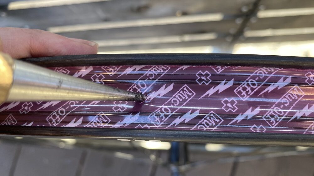 目打ちやキリの先端をライターで少し炙り、ゆっくりと穴を広げていくことで、リムテープが解けて固まり、隙間からの漏れを防ぐことができます!