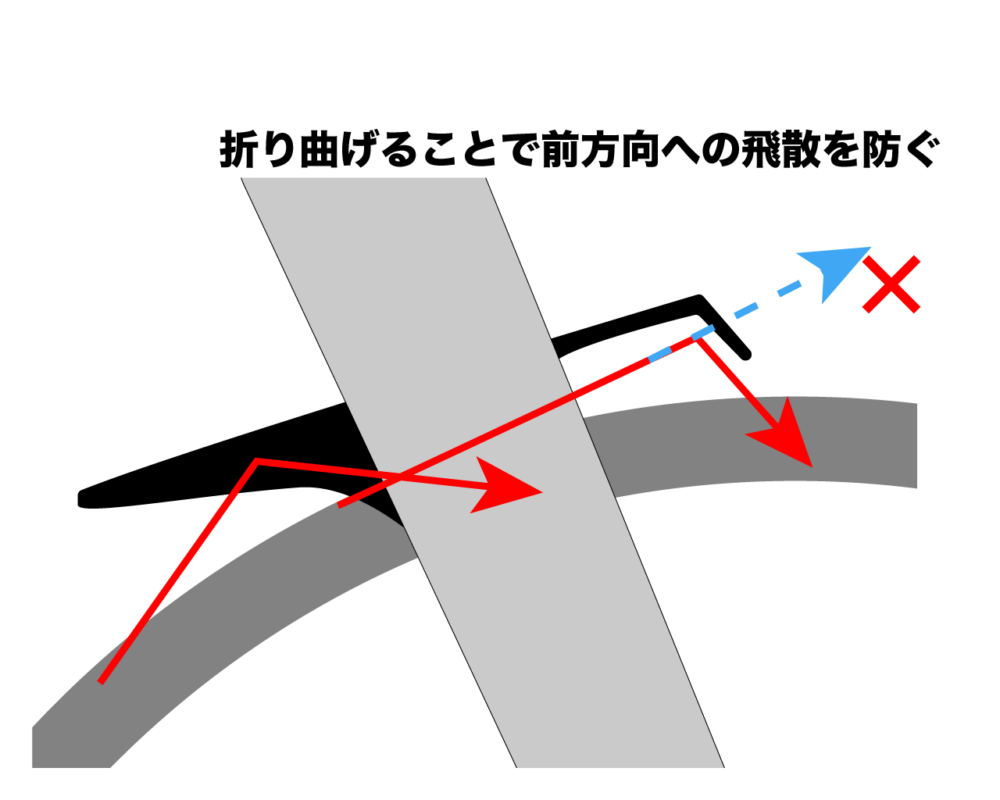 このように、タイヤとフェンダーの距離を近づけ、水が跳ねる角度と垂直に交わるようにシールドを建てることで、