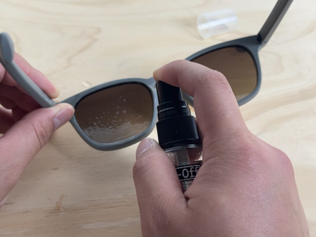 レンズ表面に汚れが付着していないことを確認し、レンズの両面にANTI FOG TREATMENTを吹きかけます。