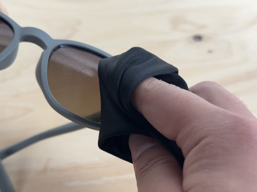 メガネ用のクロス(なければ乾いたティッシュでも)でそっと拭き取ります。
