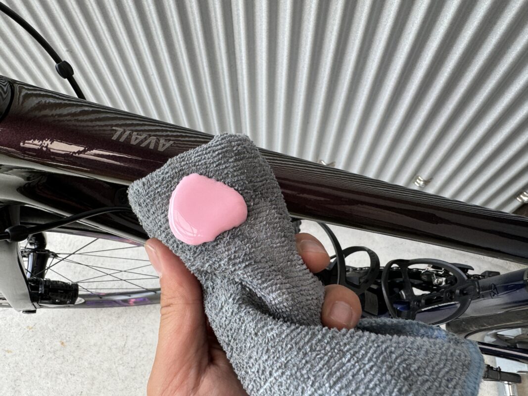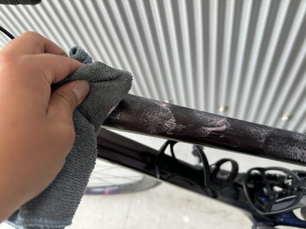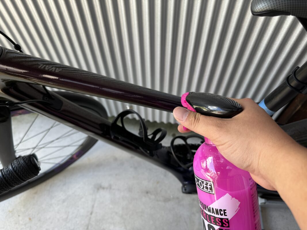 まず、フレーム全体をWATERLESS WASHなどで洗浄したうえで、MIRACLE SHINEを全体になじませます。