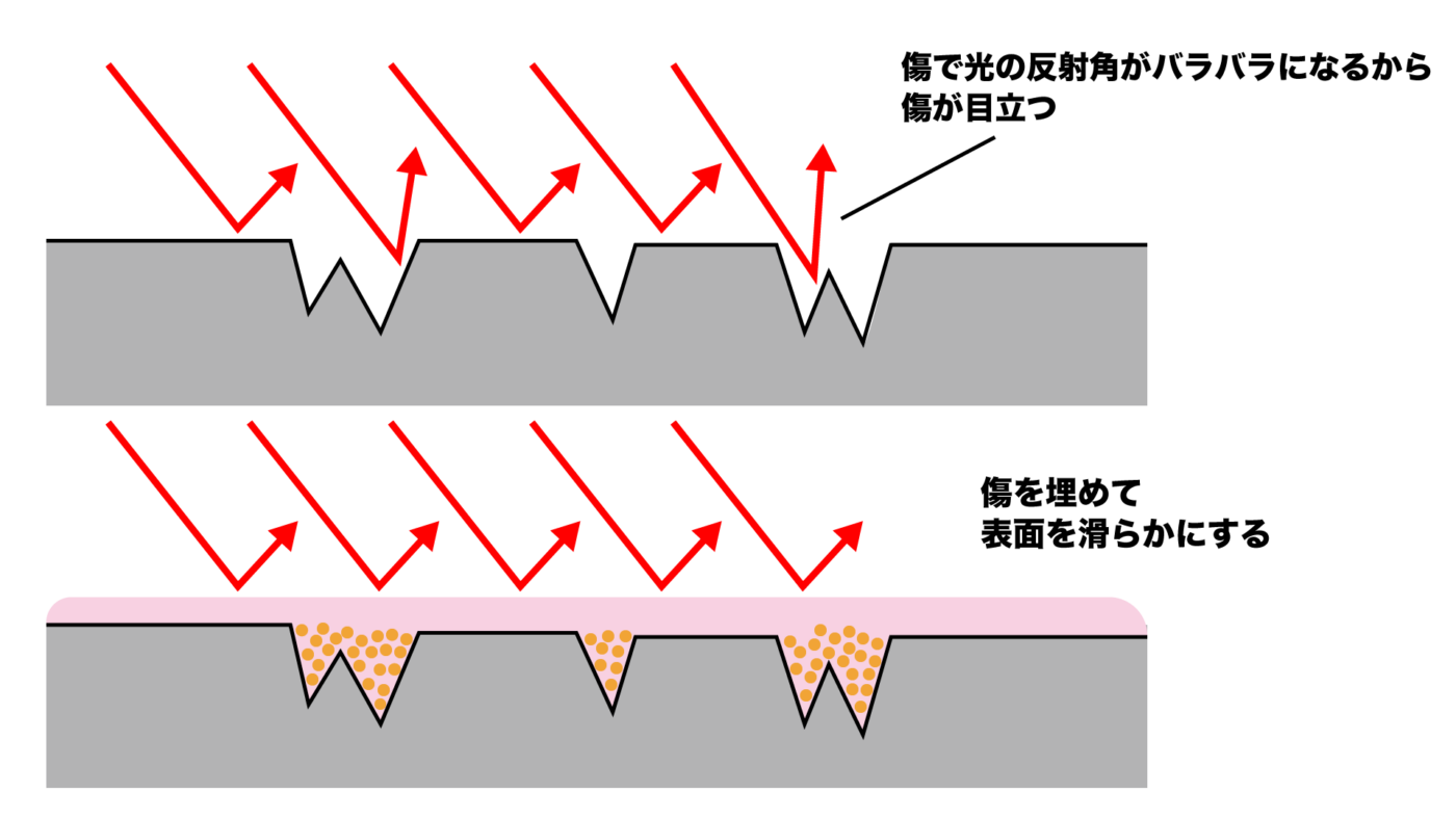 通常、傷を消す方法としては、バフがけと言われる研磨剤を含んだコンパウンドで表面を磨き、