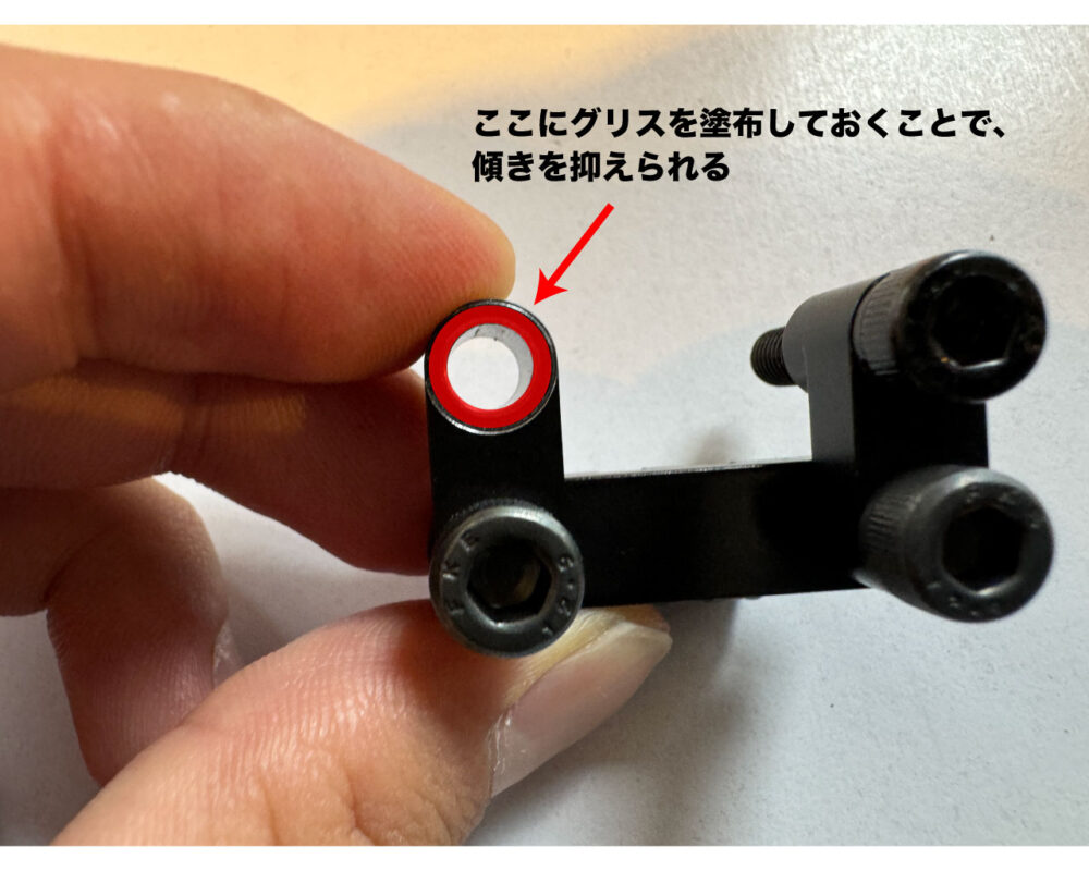 また、こちらの箇所にグリスを塗布することで、本締めした時にクイッと角度が曲がるのを防げます。